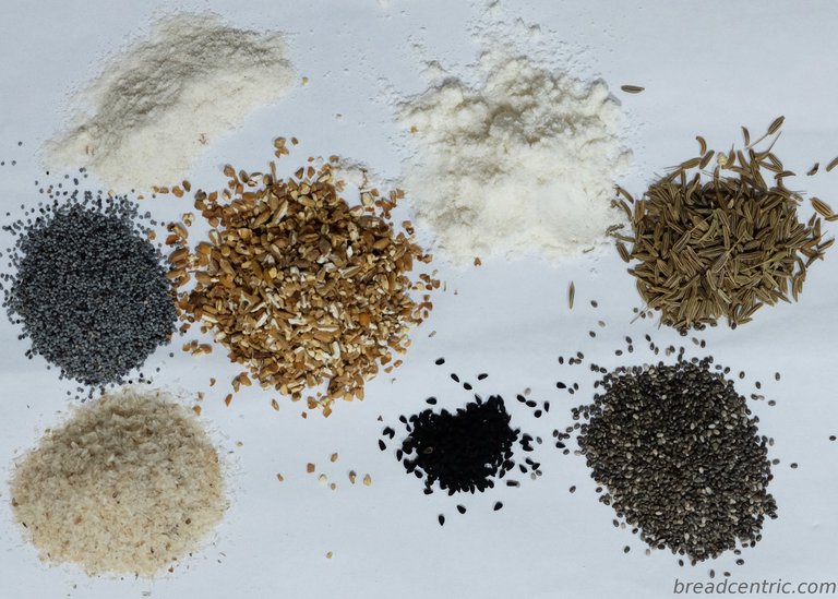 Brown rice flour, coconut flour, poppy seeds, malted cracked rye seed, caraway, psyllium husks, nigella seeds, chia seeds